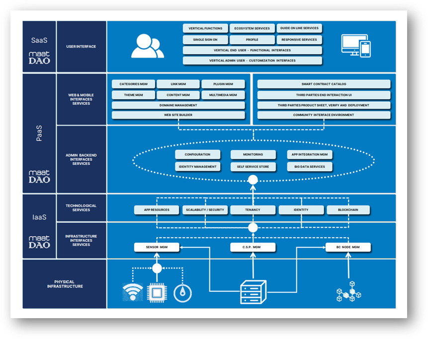 All the layers that make up the maatDAO Model interact with each other and each of them has the mission of delivering services to the whole. Each of the layers is aimed to specific user profiles (End User, IT User, System Architect User) therefore, maatDAO provides the appropriate set of interfaces for each profile depending on the Layer in which it acts