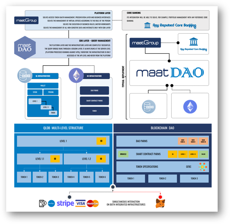 The Interoperability concept also reaches internal management, so that maatDAO guarantees the interoperability of all its internal services, structured through big trunk-type entities, from which the different (and innumerable) functional components of enormous wealth offered by the Platform are integrated