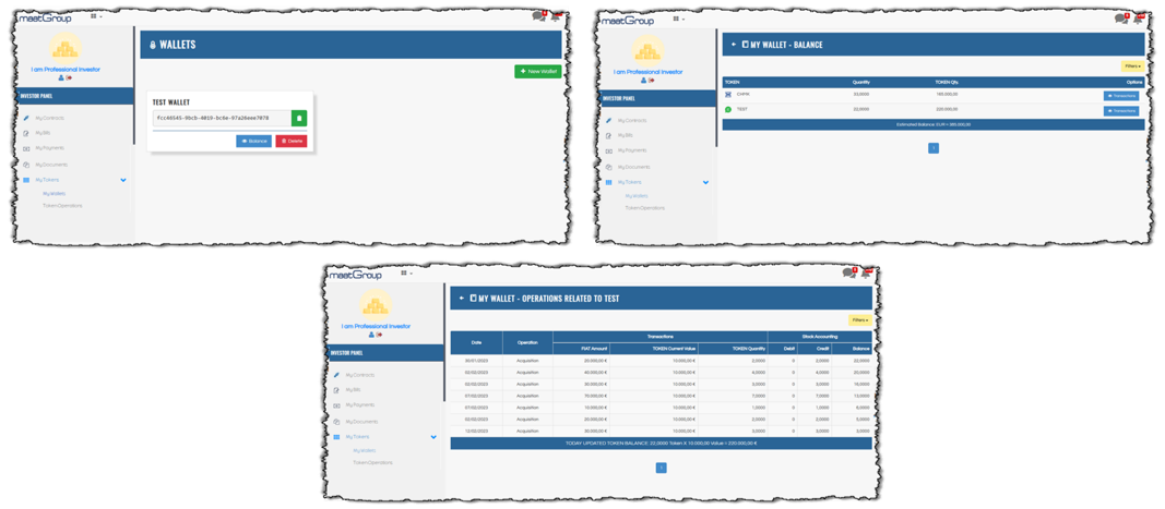 The Investor may manage as many Wallets as required. By accessing each of his Wallets, the Investor will have a consolidated view of his Tokens deposited, with their corresponding particular balance.